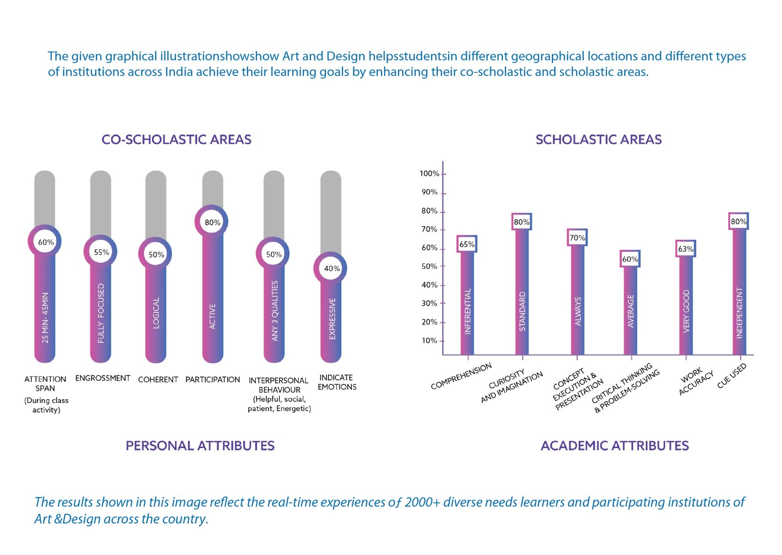 “Art & Design helped our students in many different ways in terms of behaviour, functional areas etc. Uniqueness of the subject which motivated and kept our students and educators indulged into it was customization of worksheets as per the ability of the individual(s). The method to learn and perform the activities was very much simplified which resulted into progress in the bars of performance in the report card of many students.”
